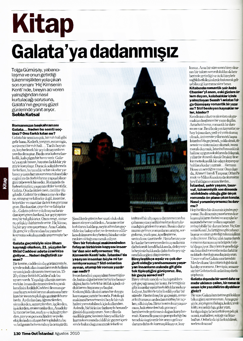 Galata için “burada yaşam zaaf ve günahlardan besleniyordu” diyor, Tolga Gümüşay, HİÇ KİMSENİN KENTİ kitabında. Hüzünlü bir göz Galata, İstanbul’un tüm tepelerini aşağılar bir vakurlukta. Gidenleri ve gelenleriyle, boşalıp dolanlarıyla, unutma hastalığına aidiyet bileti kesenleri ve inadına hayata takılarak var olmaya duranlarıyla çok başka bir istasyon Galata. İstanbul’un yalnız ve kederli oğlu… Hiç Kimsenin Kenti olacak kadar herkesin ve her şeyin…